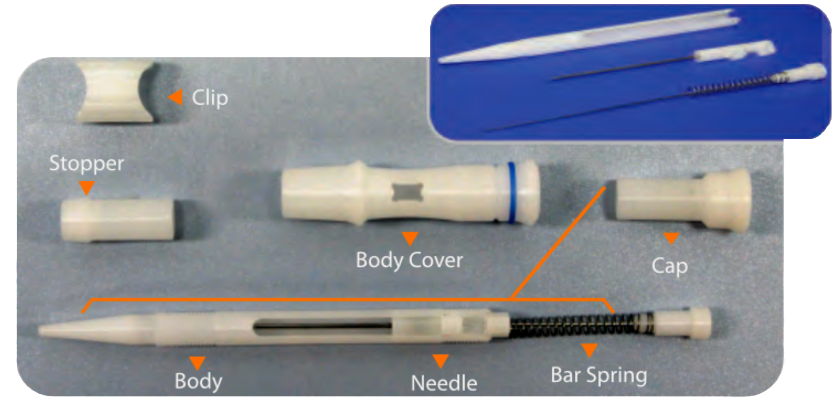 Body – основа (корпус). Needle – голка. Bar Spring – пружина. Cap – ковпачок. Body Cover – чохол для корпусу/основи. Stopper – заглушка, стопер. Clip – застібка.